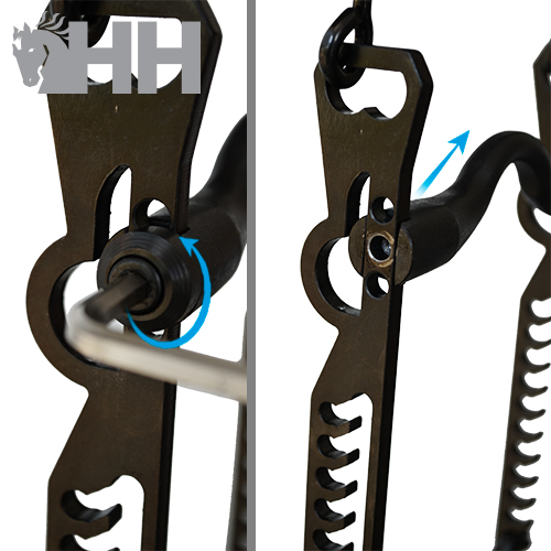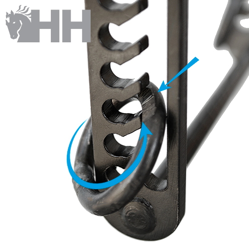 3- Longitud de la pierna: mediante la posibilidad de variar la posición de la anilla de riendas o farolillos, en hasta 13 posiciones distintas, junto también las tres posiblidades de posición de la embocadura, podemos conseguir un longitud de pierna desde 3 hasta 17 cm, pudiendo haber hasta 39 combinaciones posibles de pierna/portamozos (ver tabla adjunta).