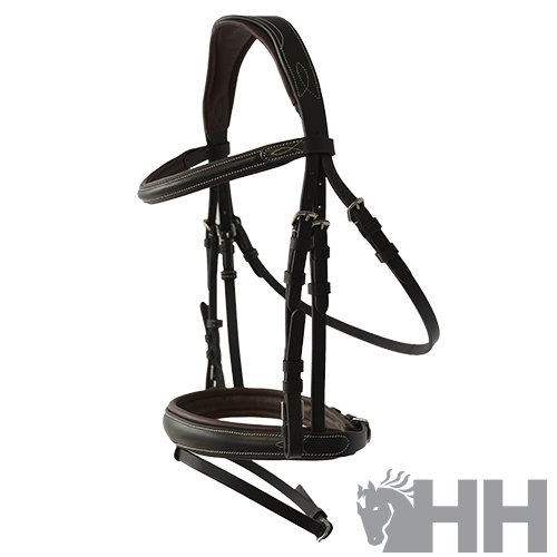 Cabezada realizada con un cuero suave y resistente. Testera ancha y anatómica para un perfecto ajuste a la nuca del caballo sin producirle presión excesiva. Muserola ancha con cierrabocas. Elegantes adornos cosidos tanto en testero, frontalera y muserola.