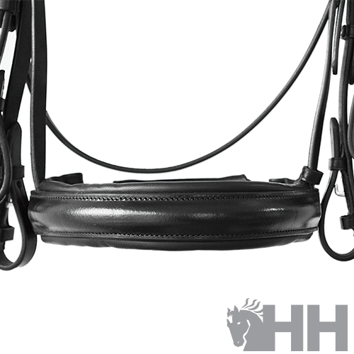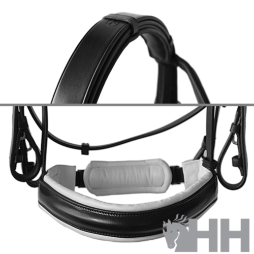 Cabezada para filete y bocado realizada con cuero de primera calidad y hebillaje de acero inoxidable. Muserola acolchada extra ancha (5 cm de anchura en la parte interior) y testera acolchada. Cierre de la muserola de dos piezas con acolchado y correa para tensar.