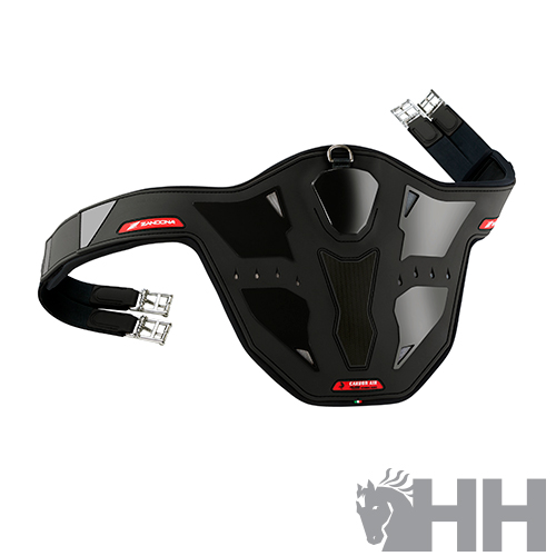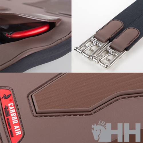 Cincha facilmente ajustable - hebilla accesible aun cuando el jinete está montado. Tiene una anilla oculta con cierre automático para mosquetones de fácil acceso.