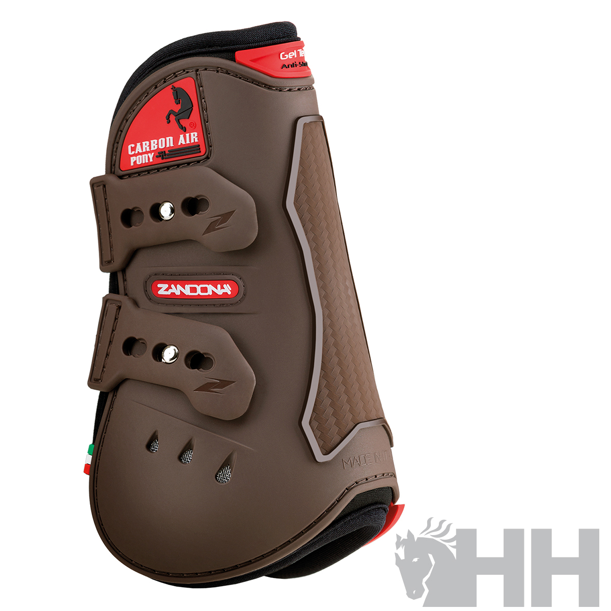 Fibra de carbono bajo la carcasa para proteger las articulaciones de la fricción externa y mejorar la resistencia a los choques. Zona Flex interna para libertad de movimiento. Dispone de correas elásticas que cierran de manera segura, con desenganche rápido. Ajuste perfecto para la extremidad del pony.