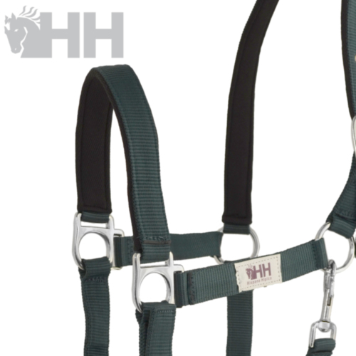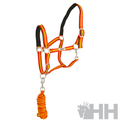 Juego de cabezada de cuadra realizada en nylon doble con refuerzos y ramal corto de 2 metros redondo con mosquetón de gatillo.
