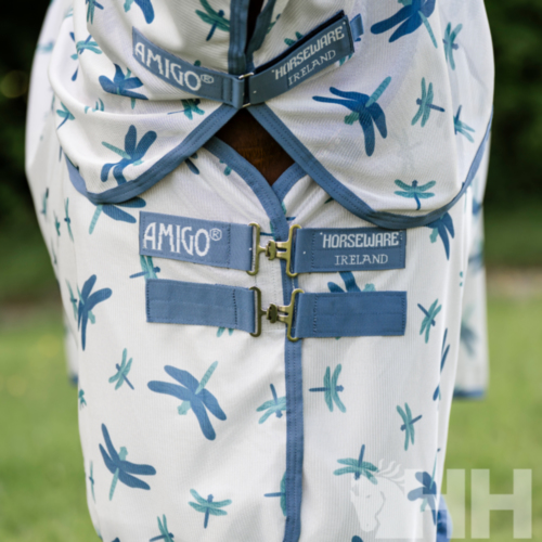 Manta realizada en poliéster ultra transpirable para proteger al caballo de todo tipo de insectos. Incorpora capucha para el cuello y el sistema patentado de diseño en arco para la posición de las manos del caballo y que éste pueda moverse con total libertad. Colores brillantes con propiedades que reflejan el sol, además de una divertida opción de estampado de libélulas.