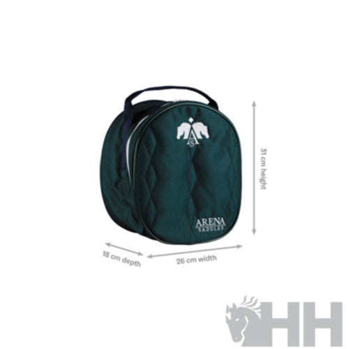 Diseñado con mucho espacio para adaptarse a la mayoría de los tamaños y estilos de casco, ¡incluso muchos con una visera adjunta! El material acolchado ofrece protección, mientras que la base duradera significa que puede soportar los caminos más embarrados. Los jinetes pueden sujetar la bolsa Arena para botas altas (se vende por separado) al anillo en D en la parte trasera de la bolsa del casco para facilitar el transporte.