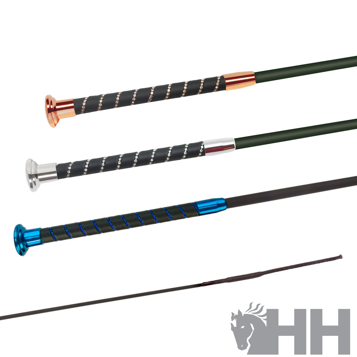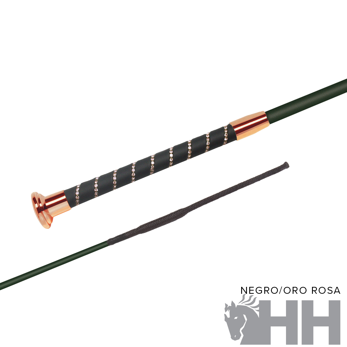 Estructura interna de fibra de vidrio. Empuñadura forrada de tejido sintético muy resistente con suave tacto a seda y con elegantes cristales brillantes. Las piezas metálicas pueden ser en color cromado u oro rosa y como novedad en toda la colección también en azul con cristales en azul.